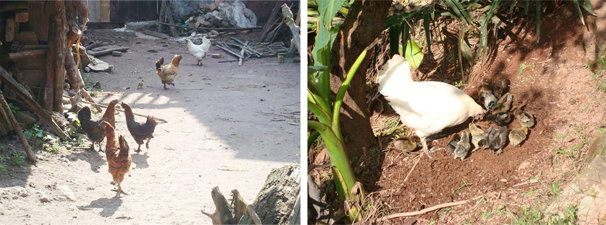 老母鸡在家旁边的自建鸡窝里下蛋并孵化。20几天不见后突然从家背后带领一群小鸡跑出跑进。绝对的生态,真正的自然生长。